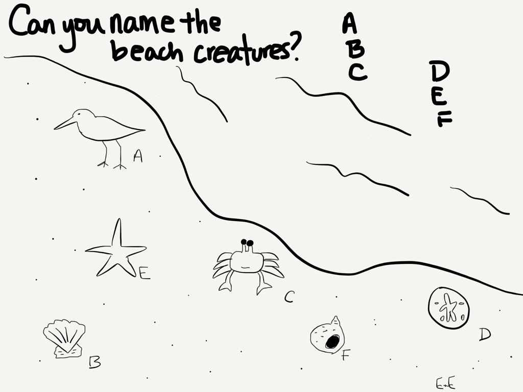 We were so excited to spend a few days down by sea shore! We saw so many wonderful creatures on the beach and swimming in the water! We drew this coloring sheet for you! Can you tell us who the creatures are? (answers below)